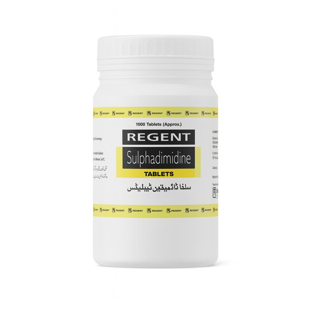 Regent Sulphadimidine Tablets are a reliable antibacterial formulation used to treat a range of infections. Each pharmaceutical-grade container offers approximately 1000 tablets, making it ideal for veterinary clinics, pharmacies, and high-demand dispensing environments. The packaging features bold branding, dual-language labeling, and a clear product identity — reflecting Regent’s commitment to quality and accessibility. Trusted for its broad-spectrum effectiveness, Sulphadimidine is a staple in antimicrobial care offering professional-grade performance in every dose.